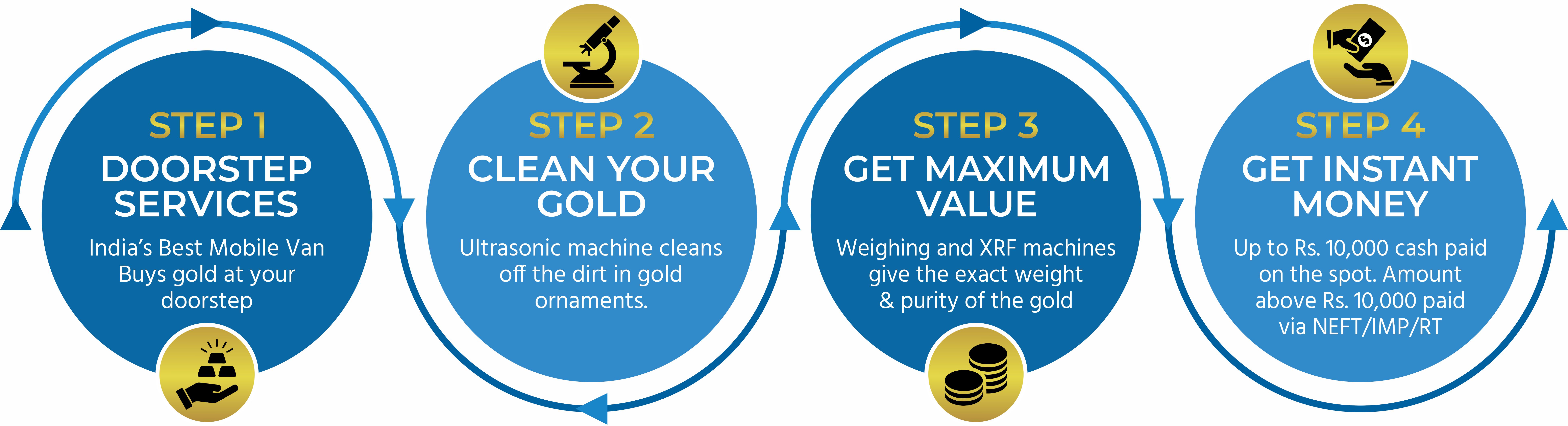 Sell your old gold for instant cash with a seamless and transparent experience. Book our mobile van service, available in PCMC and Pune. Our vans are equipped with advanced ultrasonic, weighing, and XRF machines to clean your gold for free and accurately assess its weight and purity.